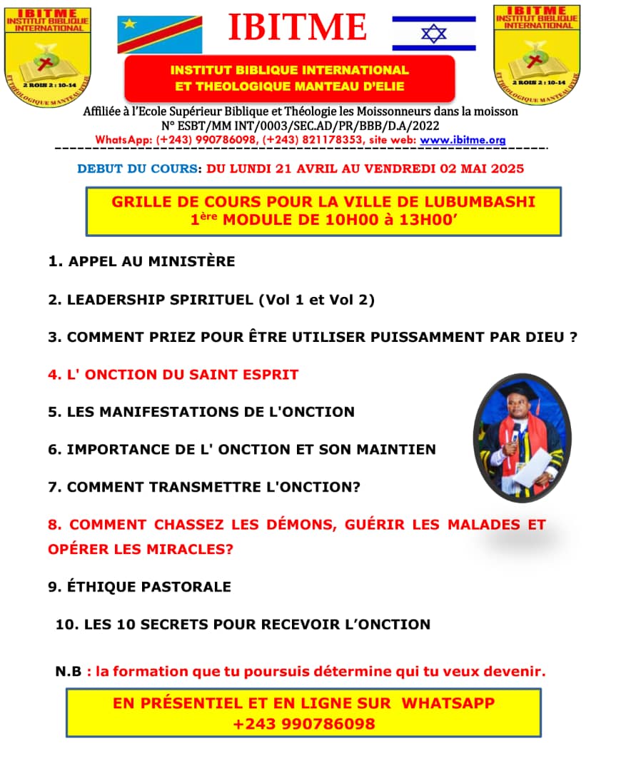 📅 Début de Cours du Lundi 11 MAI 2026. La Distance ne pas un Blocage ni Barrière pour l'Onction 🔥 où que vous Soyez à travers le monde 🌎 Vous Pouvez Suivre les Cours en ligne ☎️ dans un Groupe WhatsApp.