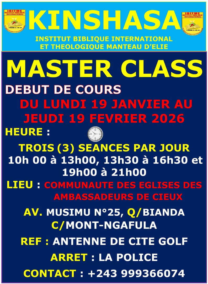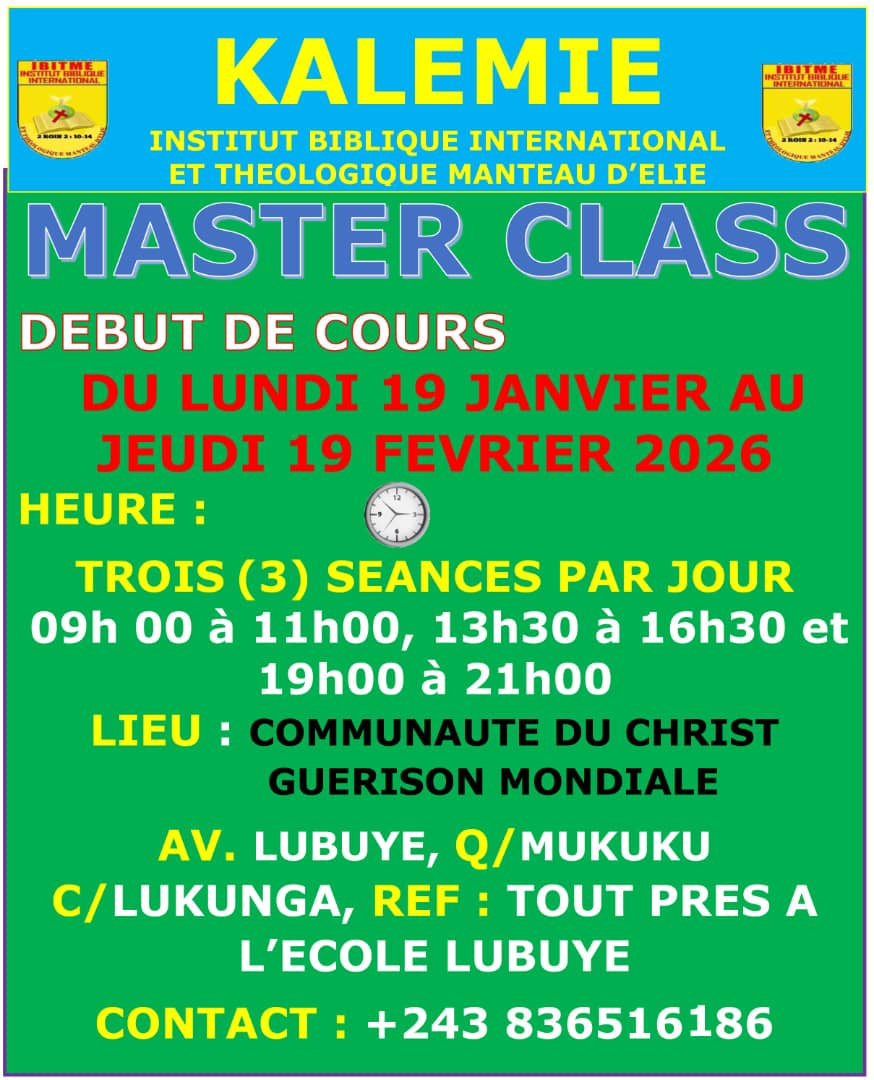 Si vous êtes à Lubumbashi, Rejoignez nous pour les Cours de Master Class en Théologie Pratique de la Bible qui se tiendra du Lundi 19 janvier au Jeudi 19 Février 2026 ⏰ 3 Séances de Formation en Présentiel 🧒 et en ligne sur WhatsApp chaque jour du Lundi au Vendredi.