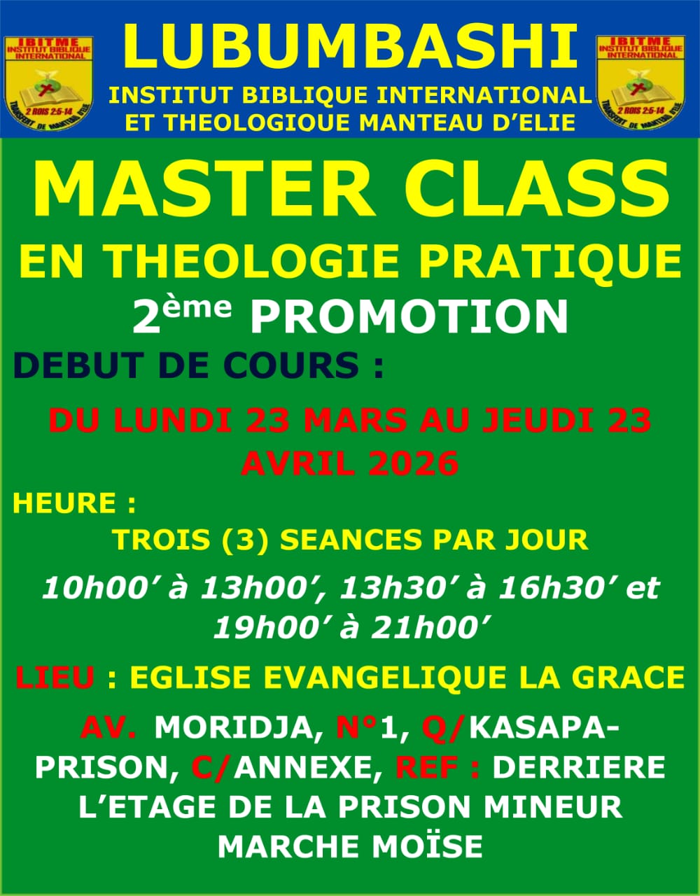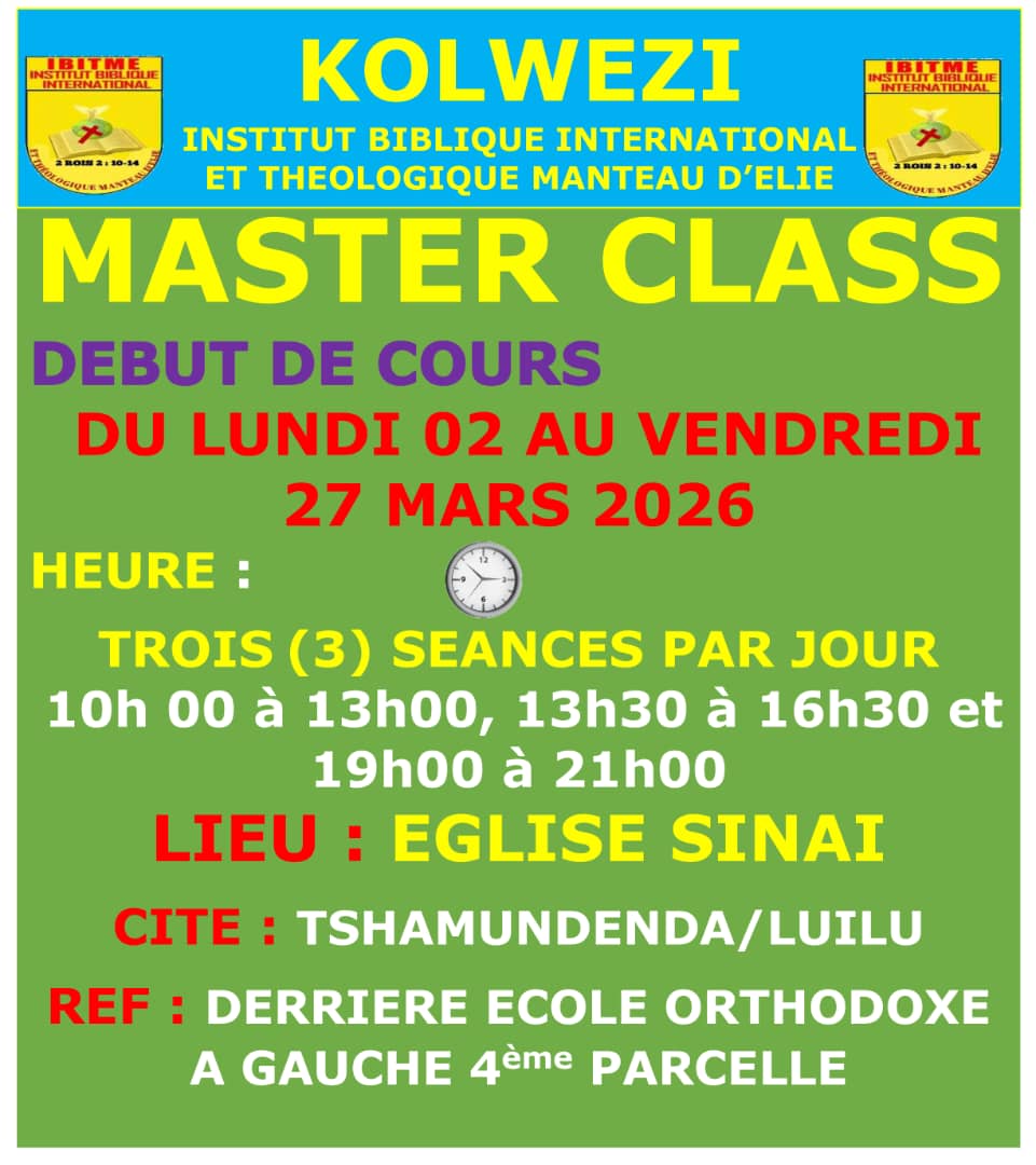 Rejoignez nous pour les Cours de Master Class en Théologie Pratique de la Bible qui se tiendra à Kolwezi du Lundi 02 Mars au Jeudi 02 Avril 2026