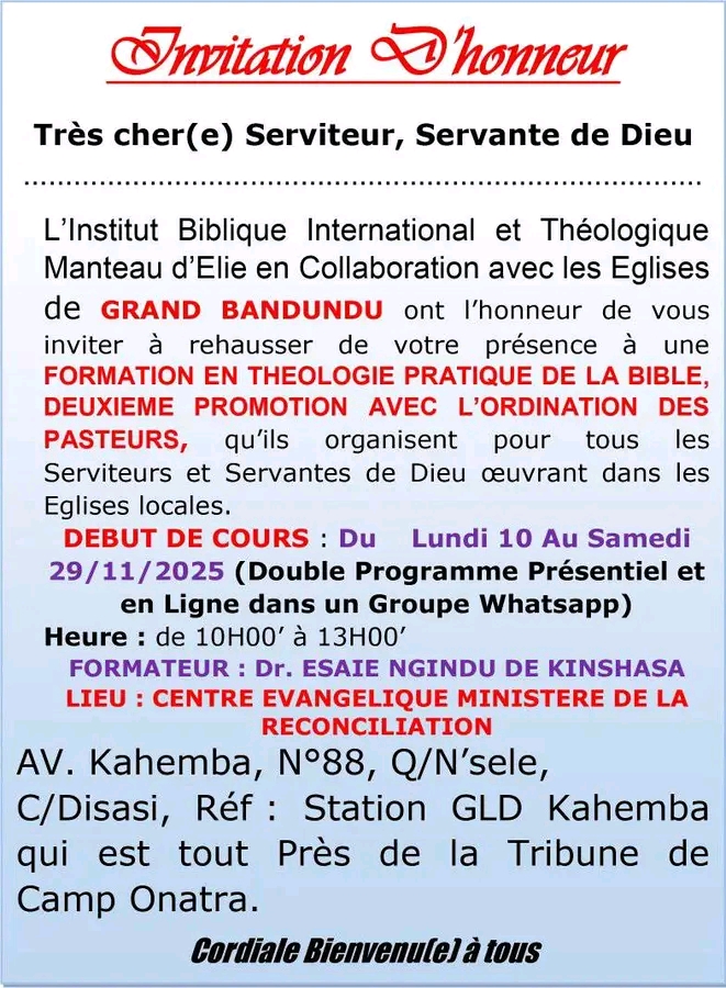 Si vous êtes dans le Grand Bandundu, Rejoignez nous pour 21 Jours de Formation en Théologie Pratique de la Bible avec le Docteur ESAIE NGINDU DE KINSHASA.