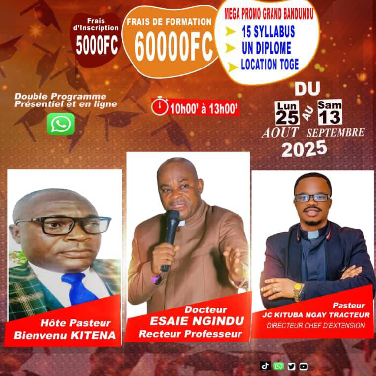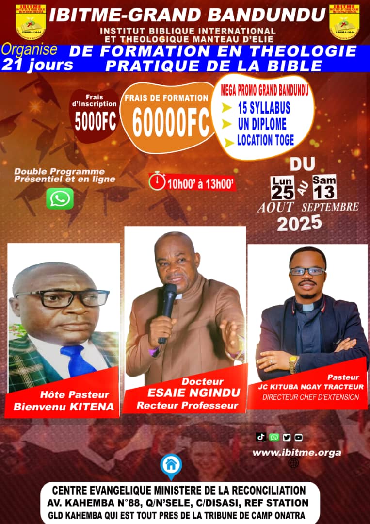 Si vous êtes dans le Grand Bandundu, Rejoignez nous pour 21 Jours de Formation en Théologie Pratique de la Bible avec le Docteur ESAIE NGINDU DE KINSHASA.
