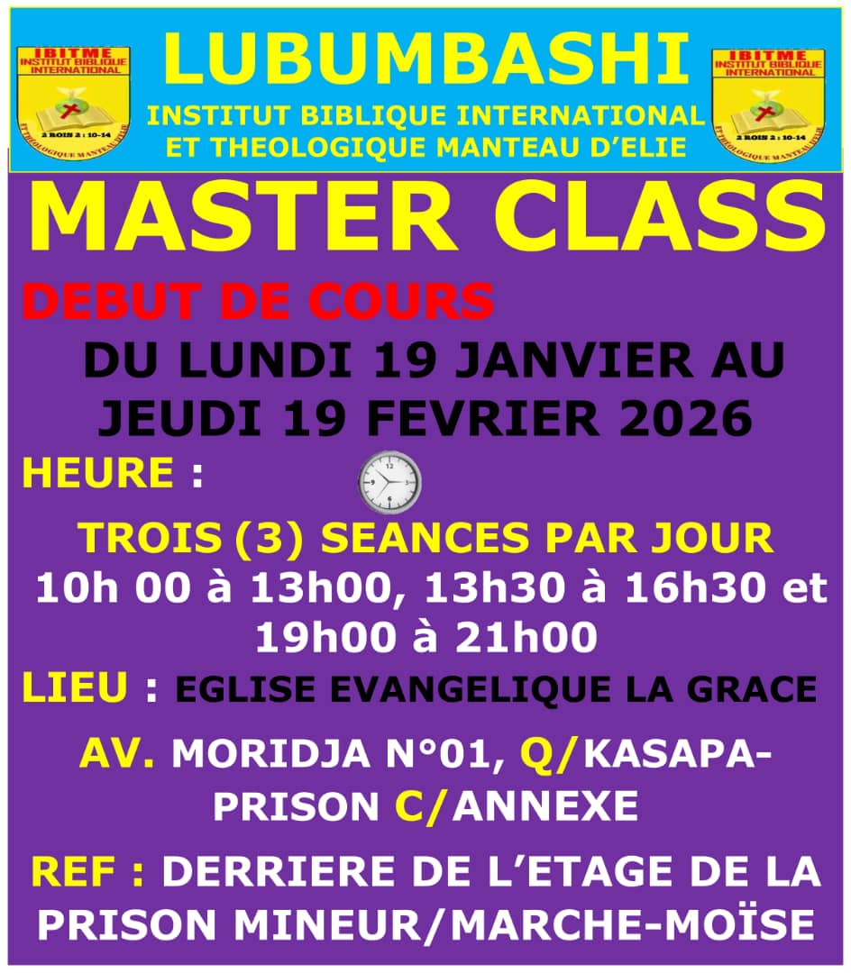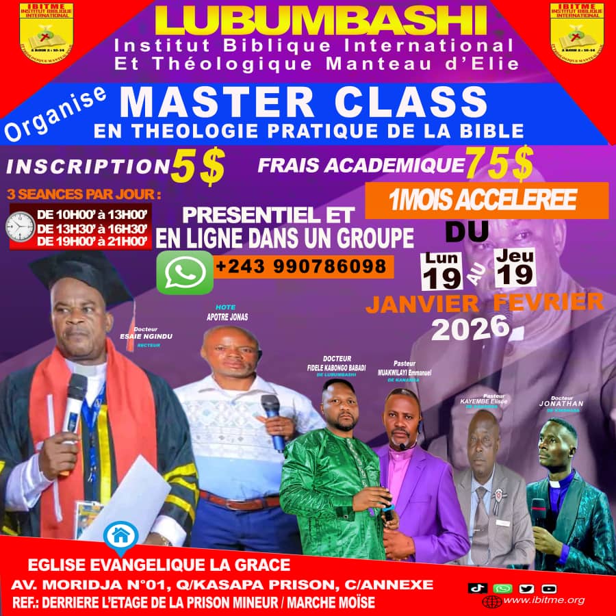 Si vous êtes à Lubumbashi, Rejoignez nous pour les Cours de Master Class en Théologie Pratique de la Bible qui se tiendra du Lundi 19 janvier au Jeudi 19 Février 2026 ⏰ 3 Séances de Formation en Présentiel 🧒 et en ligne sur WhatsApp chaque jour du Lundi au Vendredi.