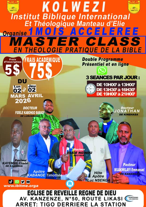 Rejoignez nous pour les Cours de Master Class en Théologie Pratique de la Bible qui se tiendra à Kolwezi du Lundi 02 Mars au Jeudi 02 Avril 2026